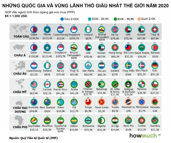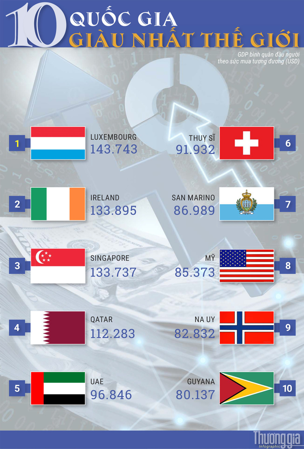 Top 20 quốc gia giàu nhất thế giới thường thấy Luxembourg, Thụy Sĩ và Ireland — Luxembourg dẫn đầu với GDP bình quân đầu người khoảng 140.941 USD, tiếp theo Ireland 108.919 USD và Thụy Sĩ 104.986 USD. Các tên khác gồm Hoa Kỳ, Singapore, Qatar và Na Uy.