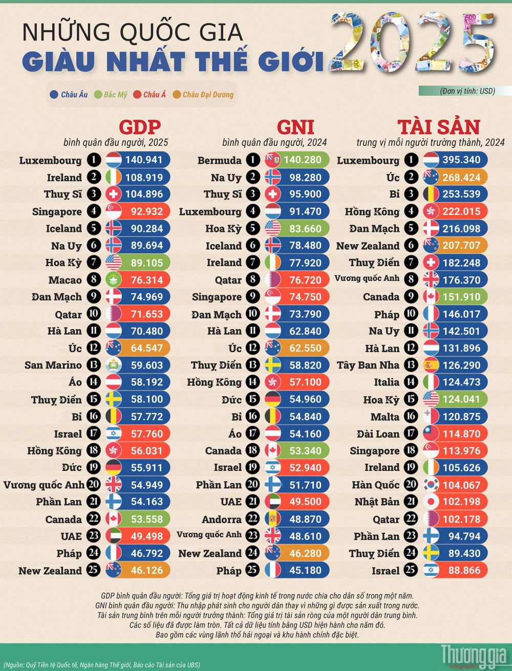 Cần nhớ là thứ hạng thay đổi theo phương pháp tính: GDP tổng (Mỹ dẫn đầu) khác với GDP bình quân đầu người (các nước nhỏ giàu hơn). Nếu quan tâm, mình khuyên bạn xem kỹ dữ liệu theo năm và theo nguồn (IMF, World Bank) để hiểu rõ vì sao một nước nhỏ có thu nhập bình quân cao nhưng tổng sản lượng lại khiêm tốn.