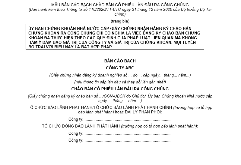Mẫu Bản cáo bạch là một tài liệu quan trọng mà các công ty đại chúng cần chuẩn bị khi chào bán cổ phiếu ra công chúng, đặc biệt trong giai đoạn cơ cấu lại doanh nghiệp. Theo Thông tư 118/2020/TT-BTC, mẫu này cung cấp thông tin chi tiết về tình hình tài chính, kế hoạch phát triển, cũng như các yếu tố rủi ro mà nhà đầu tư cần cân nhắc.