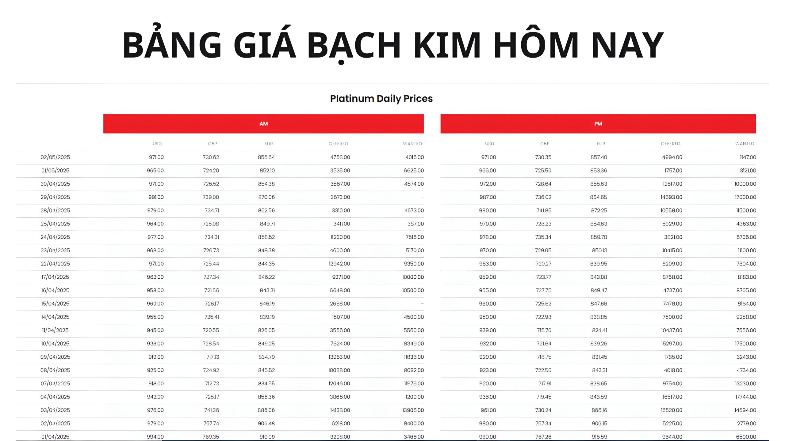 Bảng giá bạch kim cập nhật hôm nay