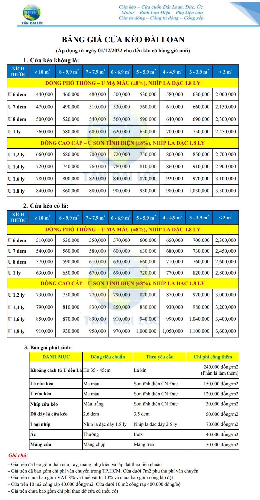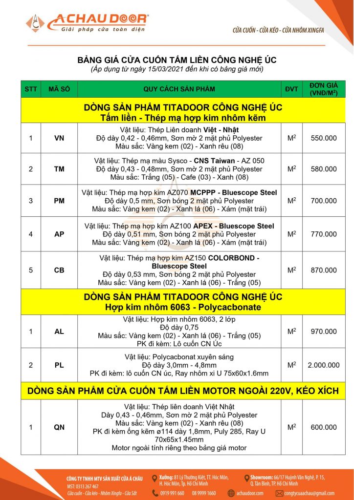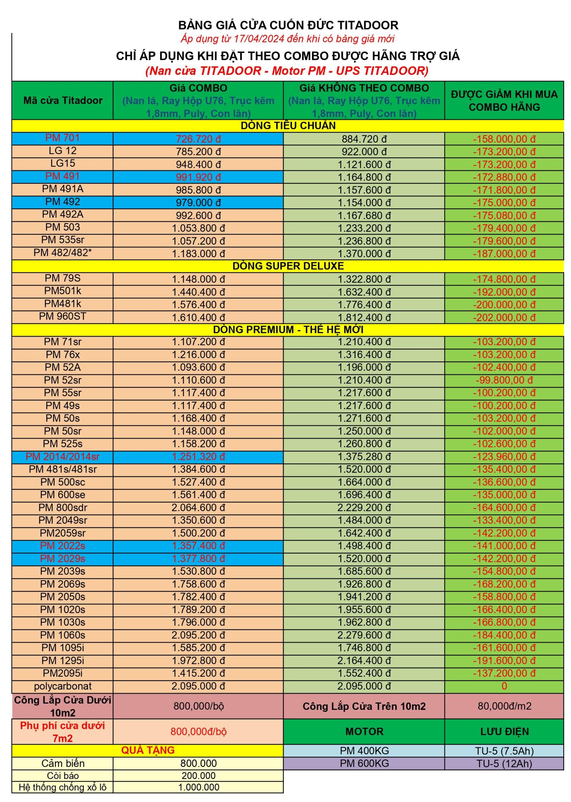 Ngoài ra, các thương hiệu nổi tiếng như Titadoor hay Mitadoor cũng có nhiều mẫu mã với giá dao động từ vài trăm nghìn đến vài triệu đồng mỗi mét vuông, tùy theo chất liệu và tính năng. Ví dụ, cửa cuốn Titadoor nan nhôm công nghệ Đức có giá từ 930.000 đồng/m², còn cửa cuốn tấm liền công nghệ Úc của hãng này khoảng 470.000 đồng/m².