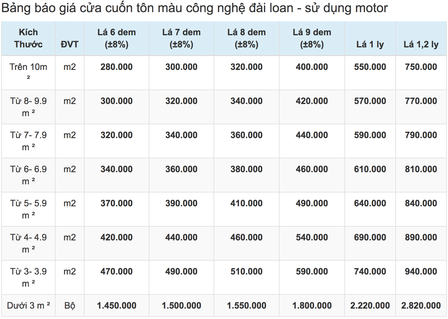Giá cửa cuốn chính hãng hiện nay khá đa dạng, tùy thuộc vào loại cửa và công nghệ sản xuất. Ví dụ, cửa cuốn tôn mạ màu công nghệ Đài Loan có giá từ khoảng 340.000 đồng/m², trong khi cửa cuốn nan nhôm hợp kim công nghệ Đức có giá từ 860.000 đồng/m². Các loại cửa cuốn tấm liền công nghệ Úc cũng được ưa chuộng với mức giá từ 450.000 đồng/m² trở lên.