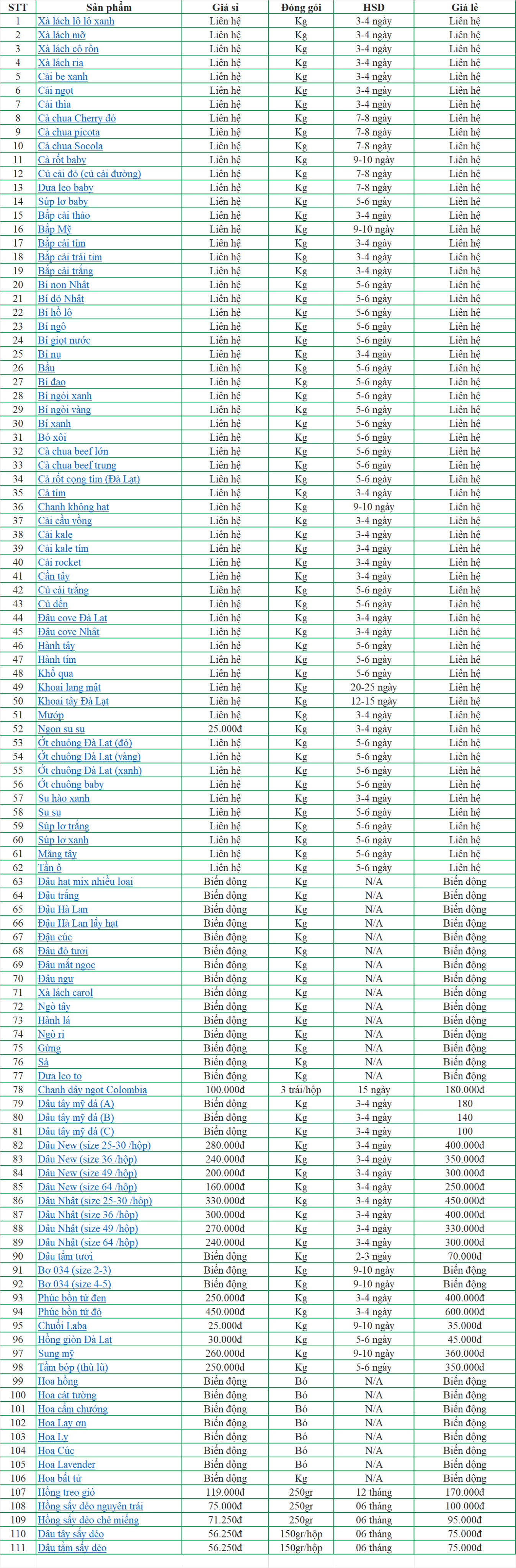 Bảng báo giá rau củ quả Đà Lạt luôn là thông tin được nhiều người quan tâm, nhất là những ai muốn mua nông sản tươi ngon, chất lượng từ vùng đất cao nguyên mát mẻ này. Giá các loại rau củ quả Đà Lạt thường dao động tùy theo mùa vụ và tình hình cung cầu trên thị trường. Ví dụ, hành lá có giá khoảng 20.000 – 25.000 đồng/kg, su su từ 10.000 – 15.000 đồng/kg, su hào và củ dền đều nằm trong khoảng 15.000 – 20.000 đồng/kg.