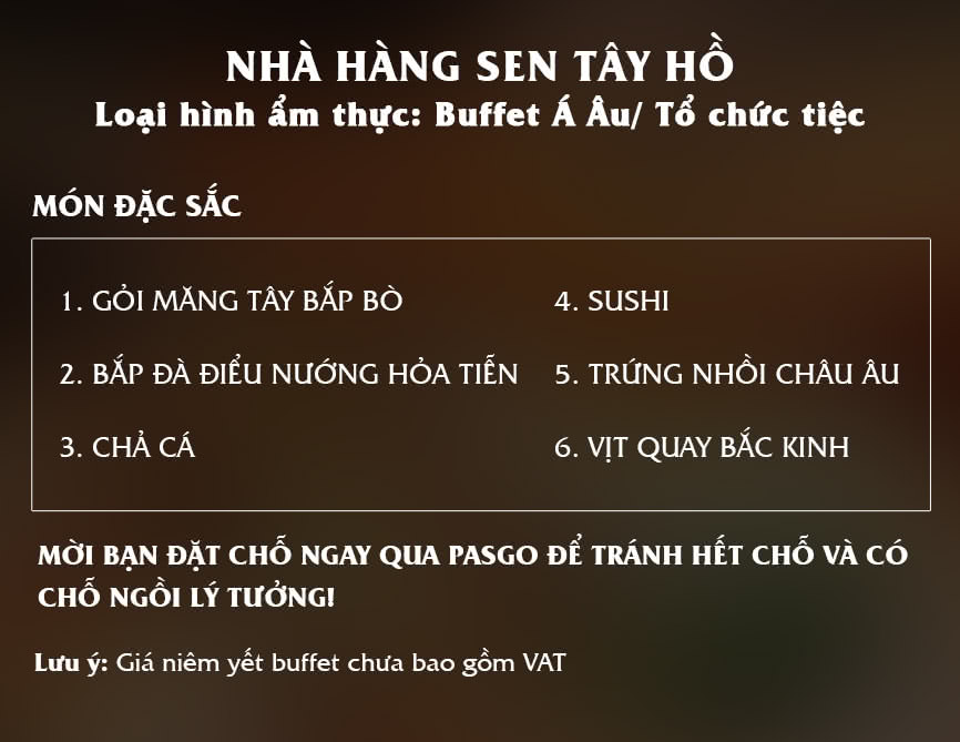 Điều đặc biệt ở Sen Tây Hồ không chỉ là mức giá hợp lý mà còn là không gian rộng rãi, thoáng đãng bên bờ hồ thơ mộng, rất thích hợp để vừa thưởng thức ẩm thực vừa tận hưởng cảnh đẹp. Buffet ở đây phục vụ đa dạng món ăn quốc tế, từ các món Á đến Âu, đảm bảo làm hài lòng cả những thực khách khó tính nhất. Tuy nhiên, giá trên chưa bao gồm đồ uống và các dịch vụ phát sinh khác, nên bạn cần lưu ý khi đặt bàn để có trải nghiệm trọn vẹn nhất.