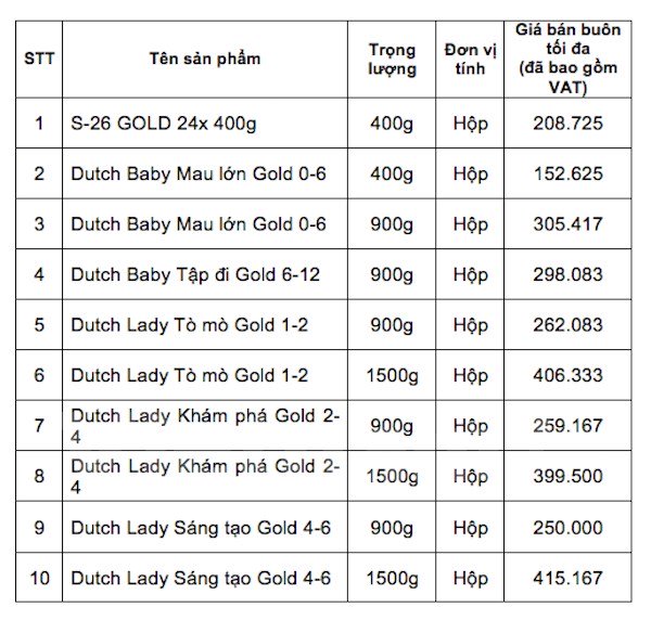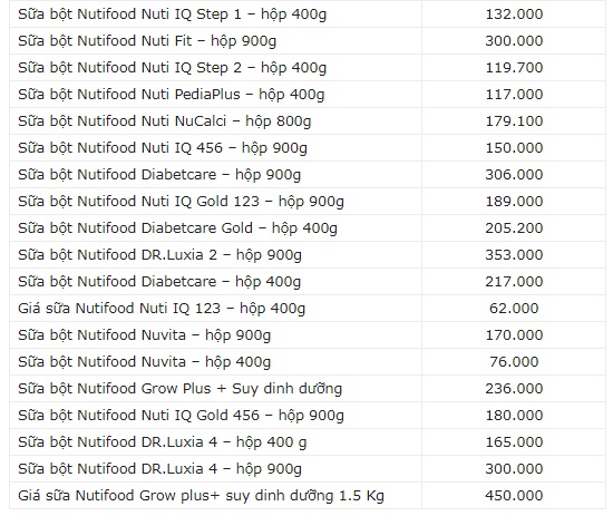 Vinamilk còn có các dòng sữa pha sẵn như Sure Prevent Gold với giá khoảng 28.500 đồng/chai 200ml hoặc thùng 24 chai giá gần 600.000 đồng, rất tiện lợi cho người bận rộn. Ngoài ra, sữa bột và các sản phẩm dinh dưỡng khác cũng được bán với mức giá hợp lý, ví dụ sữa bột CanxiPro ít béo lon 900g khoảng 369.000 đồng.