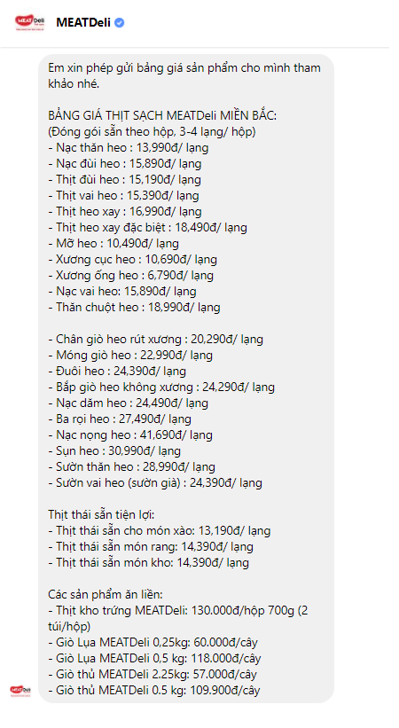 Điểm cộng lớn của Meat Deli là quy trình sản xuất khép kín, từ chăn nuôi đến giết mổ và bảo quản, giúp người tiêu dùng yên tâm về vệ sinh an toàn thực phẩm. Đây cũng là lý do nhiều người tin dùng Meat Deli khi chọn mua thịt sạch cho bữa ăn gia đình. Nếu bạn quan tâm, có thể theo dõi các kênh bán hàng chính thức của Meat Deli để cập nhật bảng giá thịt bò mới nhất.