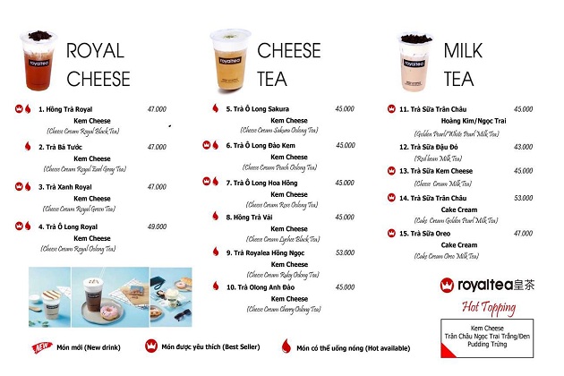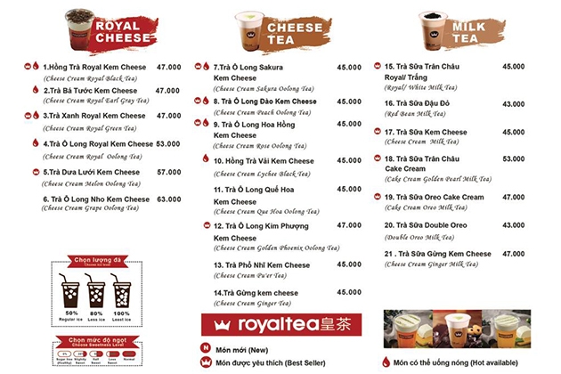 Royal Tea là thương hiệu trà sữa nổi tiếng được nhiều người yêu thích tại Việt Nam, đặc biệt ở các thành phố lớn như Hà Nội, TP. Hồ Chí Minh và Đà Nẵng. Giá cả ở Royal Tea khá hợp lý, dao động từ khoảng 30.000 đến 57.000 đồng cho một ly, phù hợp với nhiều đối tượng khách hàng, kể cả học sinh, sinh viên hay người đi làm.