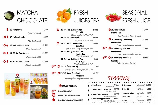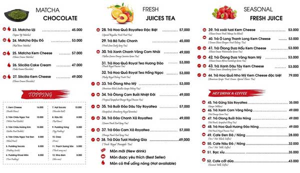 Menu đa dạng trà sữa Royal Tea hấp dẫn