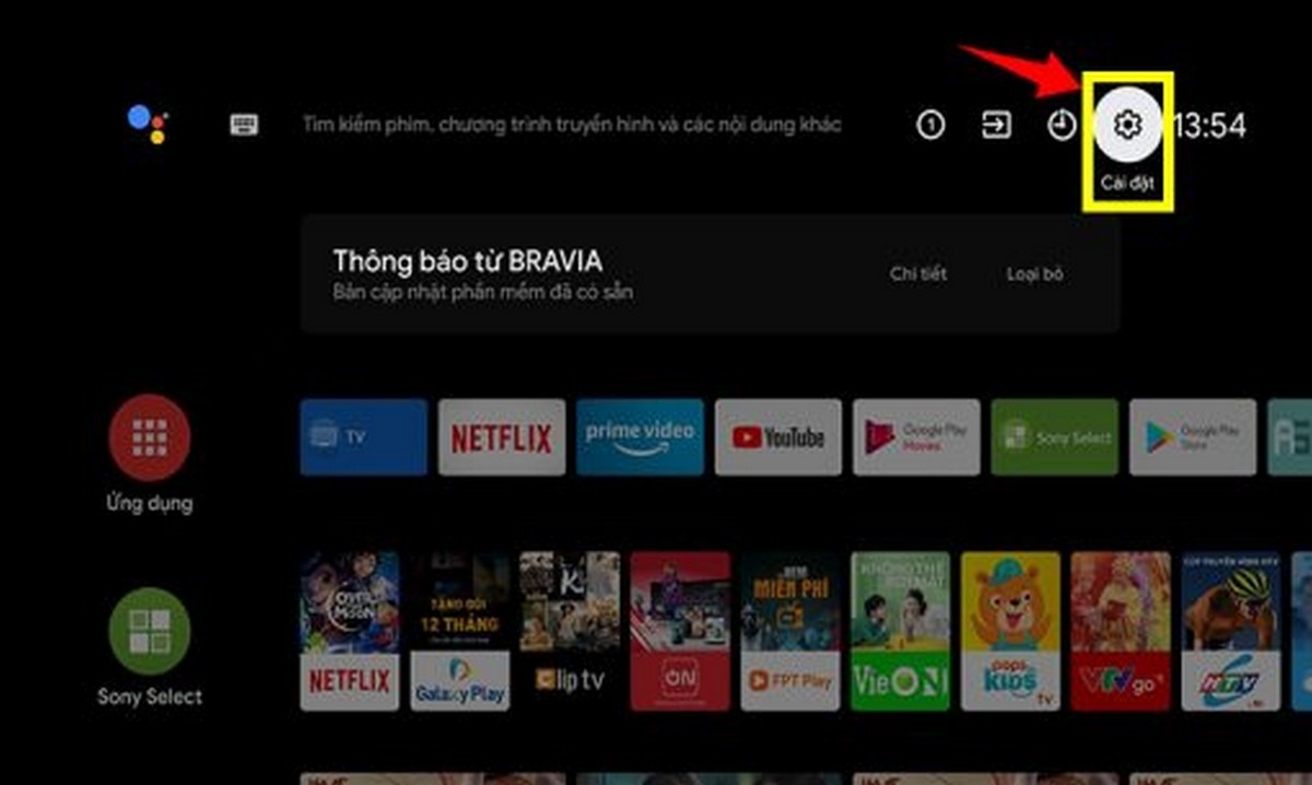 Khi muốn bật Bluetooth trên tivi Sony, bạn chỉ cần nhấn nút HOME trên remote để về màn hình chính rồi chọn mục Cài đặt (Settings). Từ đây, vào phần Cài đặt liên quan đến thiết bị và mạng — thường là Network & Accessories hoặc Remotes & Accessories — để tìm mục Cài đặt Bluetooth.