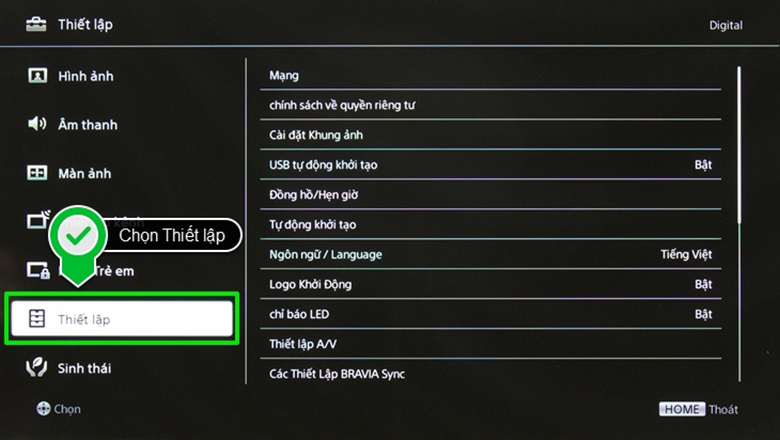 Để bật Bluetooth trên tivi Sony đời cũ, bạn nhấn nút HOME trên remote để về màn hình chính rồi chọn Cài đặt (Settings). Tùy model, mục Bluetooth thường nằm trong Mạng & Phụ kiện (Network & Accessories) hoặc trong Hiển thị & Âm thanh — vậy nên chịu khó dò một chút là thấy.