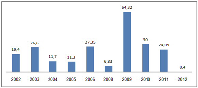 So với các năm liền kề, năm 2012 có giá vàng cao hơn năm 2013 đáng kể, khi giá vàng giảm mạnh xuống khoảng 35 triệu đồng/lượng vào năm 2013, giảm khoảng 26% so với năm 2012. Năm 2011 là năm đỉnh điểm của “sốt vàng” với giá cao nhất trong giai đoạn trước đó, còn năm 2012 là năm duy trì mức giá cao nhưng có xu hướng ổn định hơn. Qua đó, năm 2012 được xem là năm giá vàng giữ được đà tăng so với năm trước nhưng chưa tạo ra biến động quá lớn như các năm trước và sau đó.
