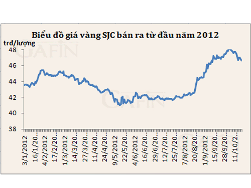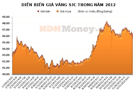 Năm 2012, giá vàng tiếp tục duy trì xu hướng tăng từ năm 2011, đạt đỉnh khoảng 45.8 triệu đồng/lượng vào đầu năm, sau đó dao động quanh mức 41 triệu đồng/lượng. Đây là năm vàng SJC được chọn làm thương hiệu vàng miếng chuẩn của Nhà nước, tạo ra sự chênh lệch giá lớn giữa vàng SJC và các thương hiệu khác, với giá vàng SJC dao động quanh 46.3 triệu đồng/lượng.