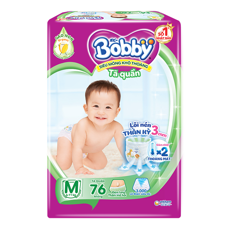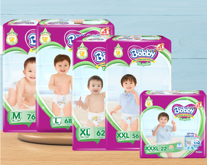 Dòng tã quần Bobby cũng rất phổ biến, có kích cỡ từ S đến XXXL, phù hợp cho bé từ 4kg đến 35kg. Giá tã quần thường dao động từ 95.000 đồng cho size S (24 miếng) đến khoảng 285.000-345.000 đồng cho các size lớn hơn như M, L hay XL (khoảng 38-76 miếng). Tã quần Bobby nổi bật với thiết kế mỏng chỉ 3mm, giúp bé thoải mái vận động mà vẫn thấm hút tốt.