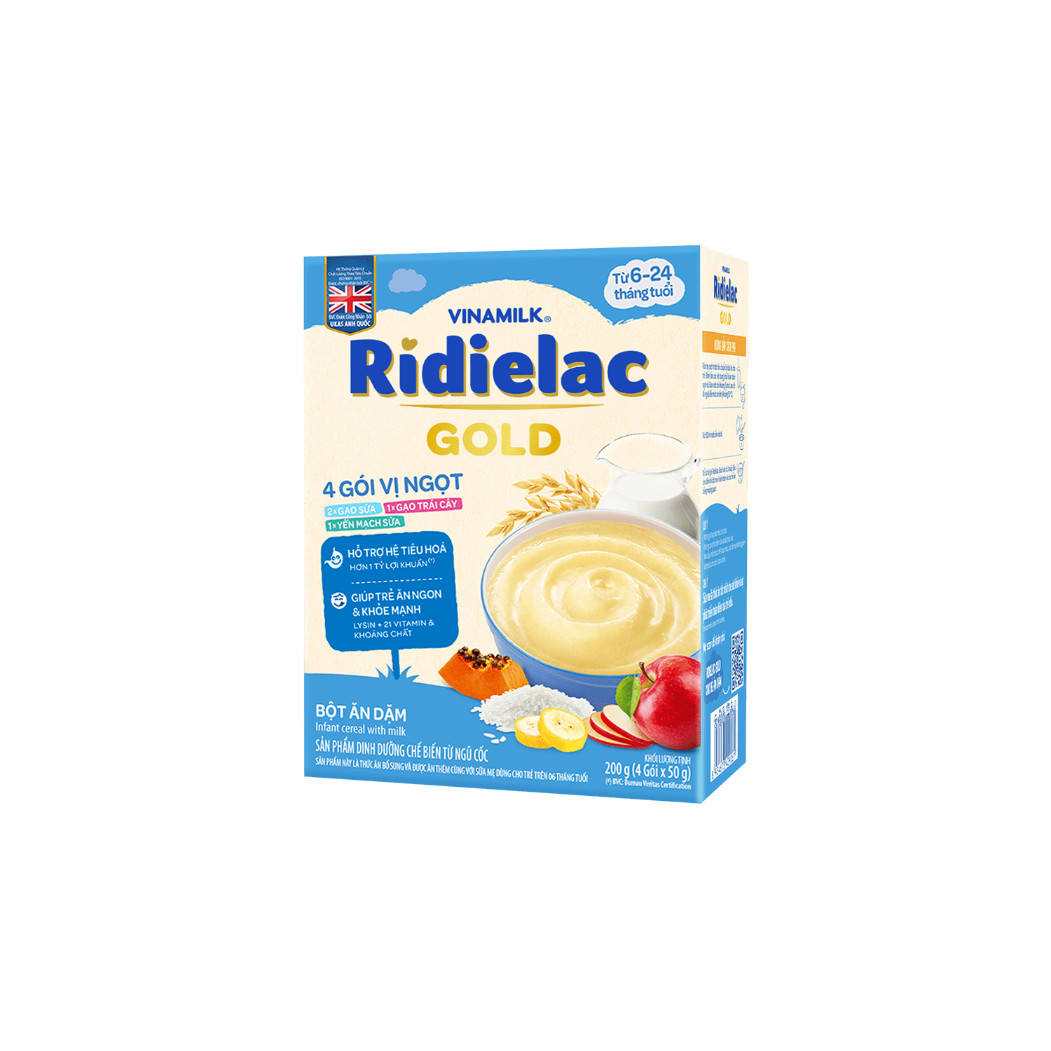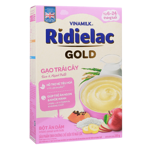 Bột ăn dặm Ridielac vị ngọt là sản phẩm của Vinamilk được nhiều mẹ tin dùng cho bé trong giai đoạn ăn dặm đầu tiên. Thành phần chính của bột bao gồm các loại ngũ cốc như gạo, yến mạch, bột trái cây (chuối, táo, đu đủ), sữa bột, đường tinh luyện, dầu thực vật cùng các loại vitamin và khoáng chất thiết yếu như canxi, sắt, kẽm, vitamin A, D3, B12… Đặc biệt, bột còn bổ sung lợi khuẩn Bifidobacterium giúp hỗ trợ hệ tiêu hóa khỏe mạnh cho bé.