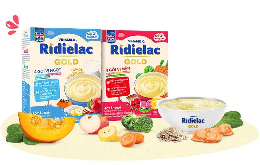 Bột ăn dặm Ridielac vị ngọt là lựa chọn được nhiều mẹ tin dùng cho bé trong giai đoạn ăn dặm đầu tiên. Sản phẩm được sản xuất bởi Vinamilk, với thành phần giàu dinh dưỡng như DHA, axit folic, i-ốt và sắt giúp hỗ trợ phát triển não bộ, thị giác và tăng khả năng nhận thức của trẻ. Đặc biệt, bột còn bổ sung lợi khuẩn Bifidobacterium giúp hệ tiêu hóa của bé hoạt động tốt hơn, giảm nguy cơ táo bón và khó tiêu.