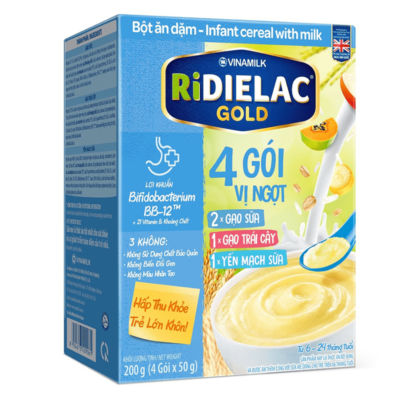 Sản phẩm không chứa phẩm màu hay chất bảo quản, an toàn cho bé. Ridielac vị ngọt có nhiều hương vị như gạo trái cây, gạo sữa, yến mạch sữa và dạng 4 gói vị ngọt tiện lợi, giúp mẹ dễ dàng thay đổi khẩu vị cho con mỗi ngày. Đây là lựa chọn phù hợp để hỗ trợ bé tăng cân đều, khỏe mạnh và phát triển trí não tốt.
