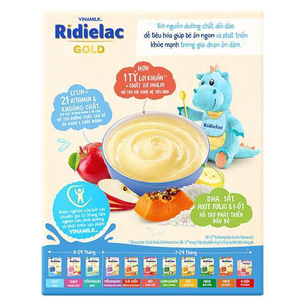 Sản phẩm còn có lợi khuẩn Bifidobacterium BB-12 và chất xơ hòa tan inulin hỗ trợ hệ tiêu hóa khỏe mạnh, giúp bé hấp thu dưỡng chất tốt hơn và hạn chế táo bón. Với hương vị ngọt dịu, dễ ăn, Ridielac giúp đa dạng bữa ăn cho bé, tạo cảm giác thích thú khi ăn dặm, từ đó phát triển thói quen ăn uống lành mạnh. Đây là lựa chọn an toàn và tiện lợi cho các mẹ trong giai đoạn bé tập ăn dặm.