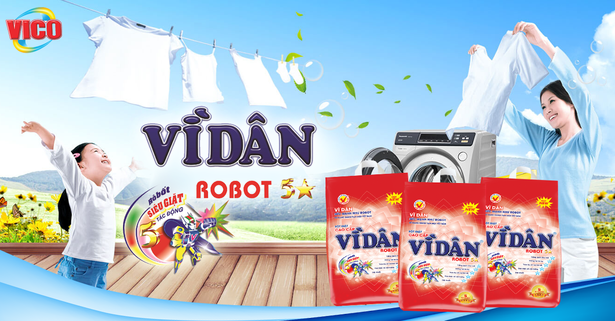 Mình thấy Bột giặt Vì Dân nổi bật lắm khi so với các loại bột giặt khác trên thị trường. Ra đời từ năm 2007, dòng Robot 5 sao của nó như “siêu anh hùng” với 5 tác động mạnh mẽ: đánh bật vết bẩn cứng đầu từ sâu bên trong sợi vải, giữ quần áo trắng sạch như mới, thơm lâu kể cả thời tiết ẩm ướt, diệt khuẩn hiệu quả và an toàn cho da tay.