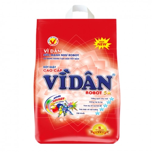 Điểm nổi bật của Bột giặt Vì Dân là khả năng tẩy sạch hiệu quả từ bề mặt đến sâu bên trong từng sợi vải. Các dòng sản phẩm như Robot 5 sao cao cấp được trang bị công thức vượt trội với chất tẩy sinh học, chất tăng trắng và hương liệu, giúp quần áo luôn trắng sáng như mới.