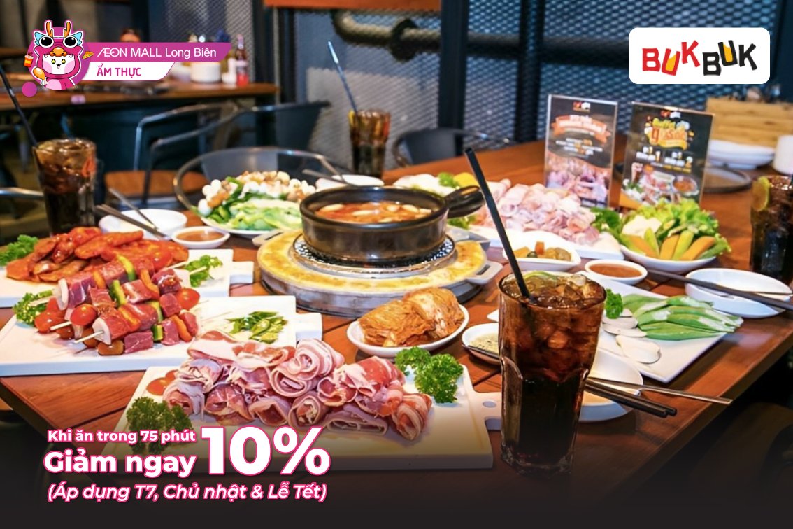 Nếu bạn đang tìm kiếm một địa điểm ăn uống hấp dẫn tại Hà Nội, thì Buk Buk ở Aeon Mall Long Biên chính là sự lựa chọn hoàn hảo cho bạn. Hiện tại, Buk Buk đang có chương trình khuyến mãi hấp dẫn: tặng 1 suất buffet trị giá 179K cho nhóm 4 khách. Đây là cơ hội tuyệt vời để cùng nhau thưởng thức những món nướng đúng chất đường phố Hàn Quốc, với những miếng thịt tươi ngon đang xèo xèo trên bếp.