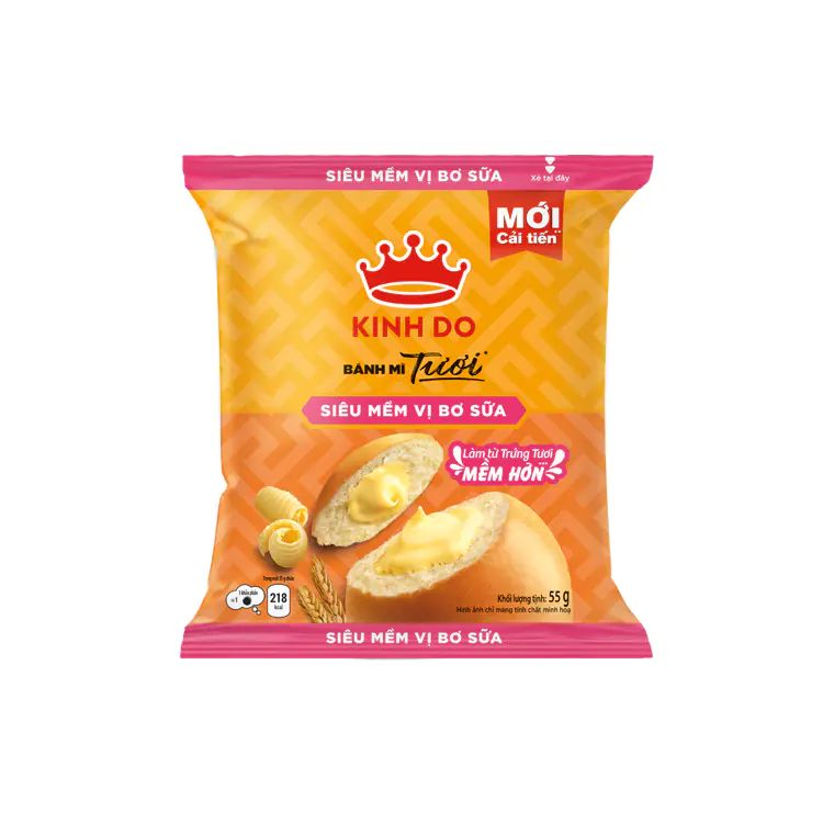 Đặc biệt, lớp vỏ bánh được thiết kế siêu mềm, cùng với nhân bơ sữa béo ngậy, mang lại trải nghiệm thưởng thức khó quên. Bánh mì Kinh Đô không chỉ thơm ngon mà còn rất đa dạng, từ bánh mì tươi bơ sữa cho đến bánh mì tươi vị socola, phù hợp với khẩu vị của nhiều người.