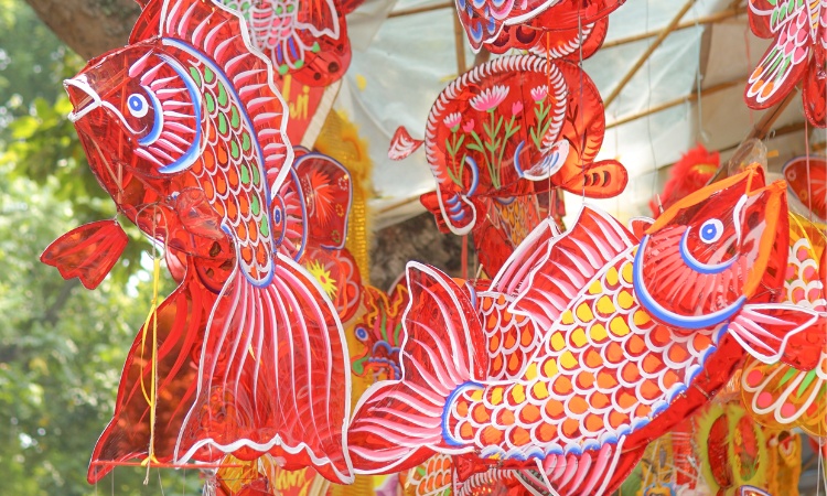 Ngoài đèn giấy lụa, đèn Trung Thu hình cá chép cũng rất phổ biến với các mẫu lớn, giá khoảng 140.000₫. Các bước làm lồng đèn cũng không quá phức tạp. Chỉ cần một tờ giấy bìa màu đỏ, bạn có thể vẽ hình tròn 20cm rồi cắt ra, sau đó gấp và trang trí theo ý tưởng của riêng mình. Việc này không chỉ giúp bé phát triển kỹ năng sáng tạo mà còn mang lại những kỉ niệm đẹp trong dịp Trung Thu.