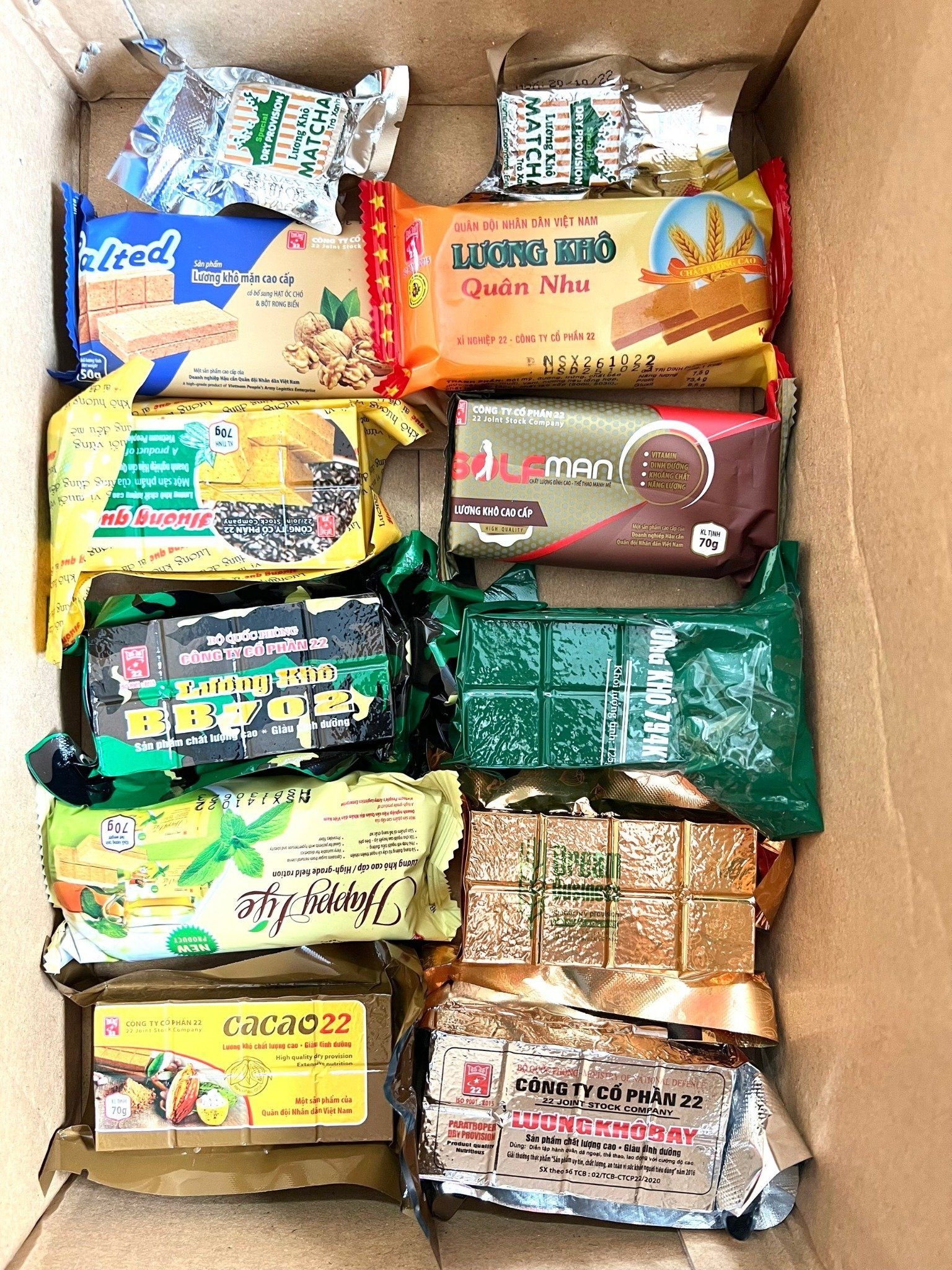 Lương khô quân đội 900 được làm từ các nguyên liệu tinh khiết như bột mì, dầu thực vật, và sữa bột, mang đến hương vị giòn ngon và bổ dưỡng. Đặc biệt, chúng có thời hạn sử dụng lên đến 3 năm, rất thích hợp cho những chuyến đi xa hay nhu cầu dự trữ thực phẩm. Một gói lương khô chỉ với 25.000 VNĐ cũng là một lựa chọn tiết kiệm cho những ai muốn dùng thử.