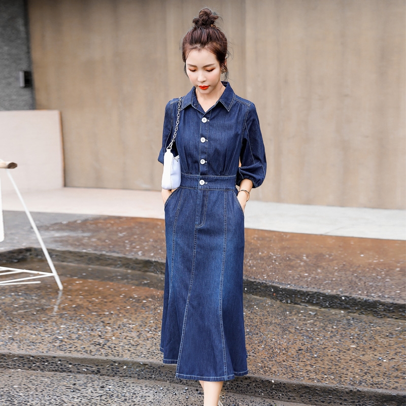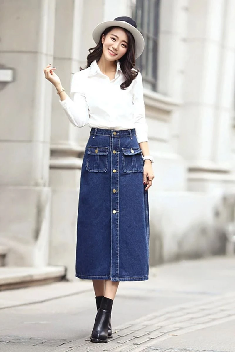 Một sự lựa chọn khác không thể thiếu trong tủ đồ chính là đầm jeans bò công sở, với chất liệu mềm mại, dáng suông dài và chi tiết cúc đen cùng túi nắp ngực sang trọng. Nếu bạn yêu thích vẻ đẹp thanh lịch và nữ tính, chiếc váy dáng đuôi cá sẽ là sự lựa chọn hoàn hảo.