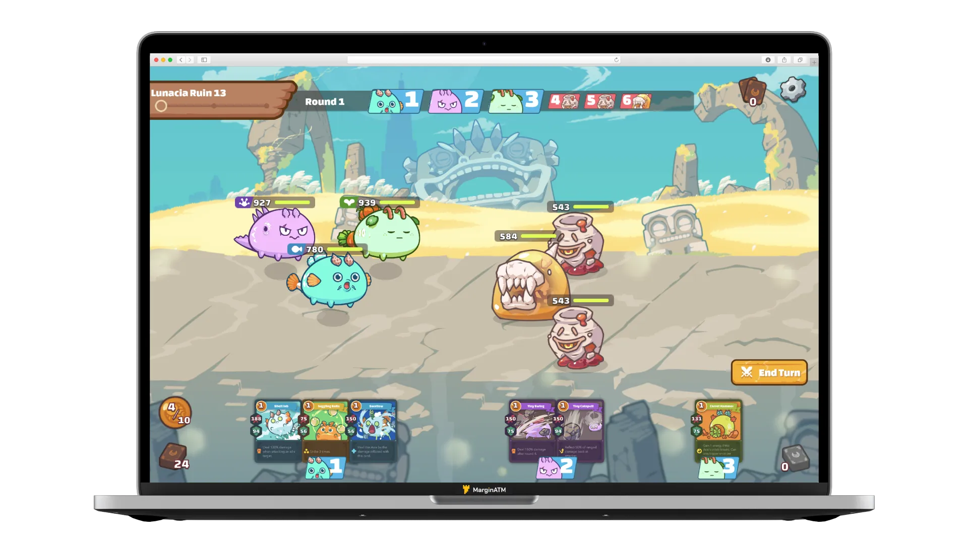 Bạn sẽ chọn các lá bài phù hợp dựa trên lượng máu và khả năng phòng thủ của đối thủ để tối ưu hóa sát thương. Sau khi chọn xong, bấm “End turn” để bắt đầu lượt đấu. Trận đấu kết thúc khi một bên bị hạ gục cả ba Axie.