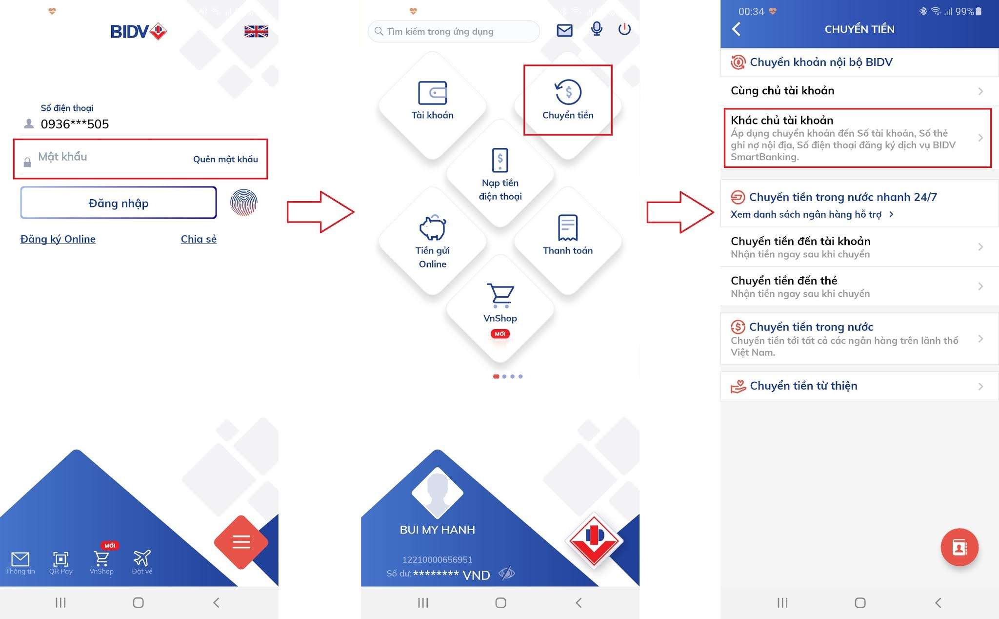Ngoài ra, bạn cũng có thể chuyển tiền qua ứng dụng ngân hàng BIDV Smart Banking. Sau khi đăng nhập, chọn chuyển tiền nội bộ BIDV, nhập số tài khoản định danh của BSC (thường là ký tự “BSC” cộng với số tài khoản chứng khoán), kiểm tra tên người nhận cho chính xác rồi nhập số tiền và xác thực giao dịch. Cách này rất tiện lợi nếu bạn có tài khoản BIDV và muốn chuyển nhanh chóng, an toàn.