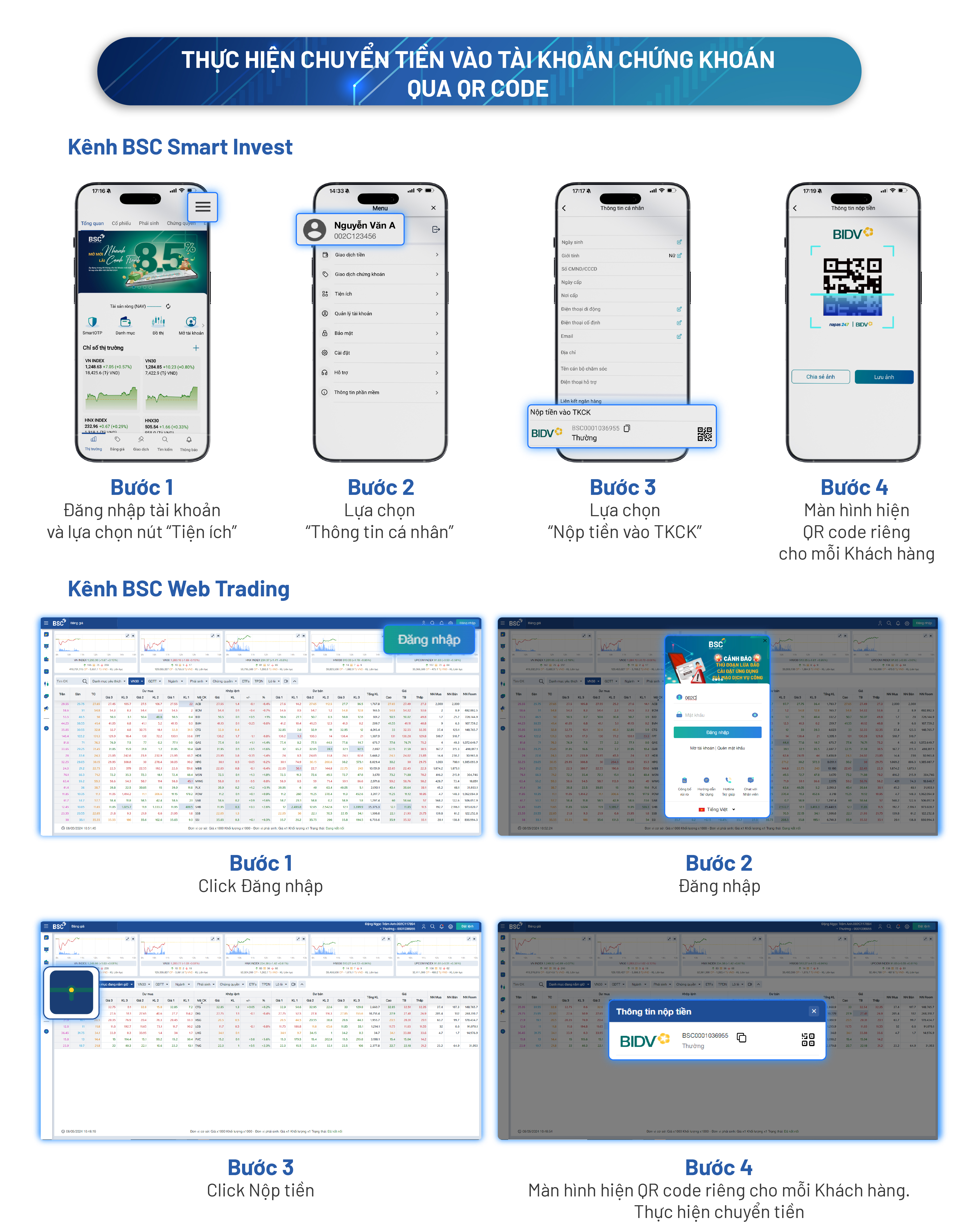 Để chuyển tiền vào tài khoản chứng khoán BSC, bạn có thể thực hiện rất dễ dàng với vài bước đơn giản. Cách phổ biến nhất là nộp tiền qua mã QR Code. Bạn chỉ cần đăng nhập vào BSC Web Trading hoặc ứng dụng BSC Smart Invest, lấy mã QR Code của tài khoản chứng khoán, sau đó mở ứng dụng ngân hàng để quét mã này. Tiếp theo, nhập số tiền cần nộp và xác thực giao dịch bằng mã Smart OTP là xong. Tiền sẽ được chuyển ngay vào tài khoản chứng khoán của bạn.