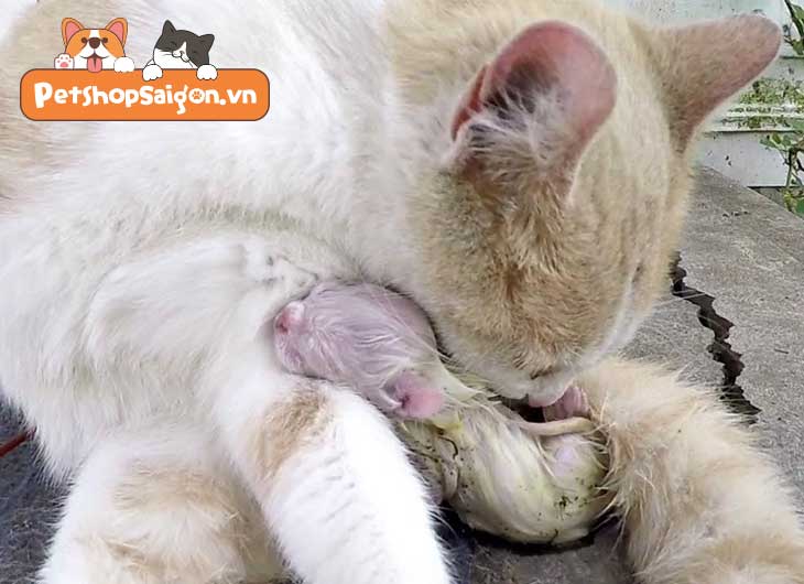 Giữ không gian sạch sẽ, tránh làm mèo căng thẳng bằng cách giữ khoảng cách, chỉ hỗ trợ nhẹ nhàng khi mèo con ra đời – lau sạch túi ối, kích thích thở bằng cách xoa nhẹ ngực bụng.