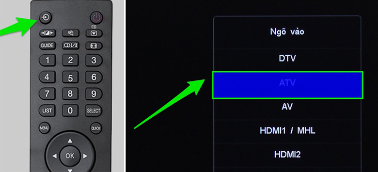 Nếu cần đổi nguồn vào, bấm nút input/đầu vào (biểu tượng vòng tròn mũi tên) trên remote rồi chọn HDMI, TV, USB hoặc chế độ thu sóng phù hợp. Trước khi dò lại, kiểm tra và siết chặt ăng-ten, dây cáp để tránh mất kênh hoặc bị nhiễu, rồi thực hiện dò tự động.