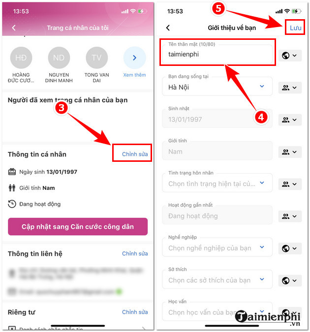 Một cửa sổ mới sẽ hiển thị, trong đó bạn chọn “Chỉnh sửa” ở mục thông tin cá nhân. Tại đây, bạn hãy điền tên thân mật mới vào ô trống. Khi đã điền xong, nhớ ấn “Lưu” để thay đổi được cập nhật.