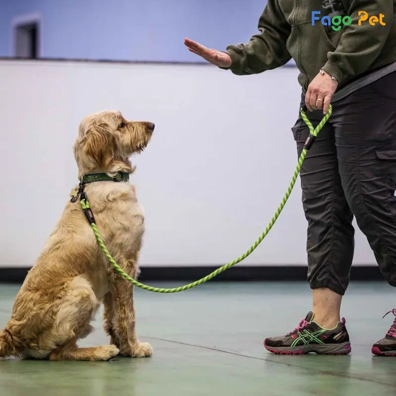 Dây dắt ngắn khoảng 1m hỗ trợ kiểm soát tư thế, đặc biệt khi dạy ngồi vững bằng cách nâng cổ chó nhẹ nhàng. Nếu muốn chuyên sâu hơn, còi siêu âm phát âm thanh chỉ chó nghe thấy, lý tưởng cho luyện từ xa mà không làm phiền hàng xóm.