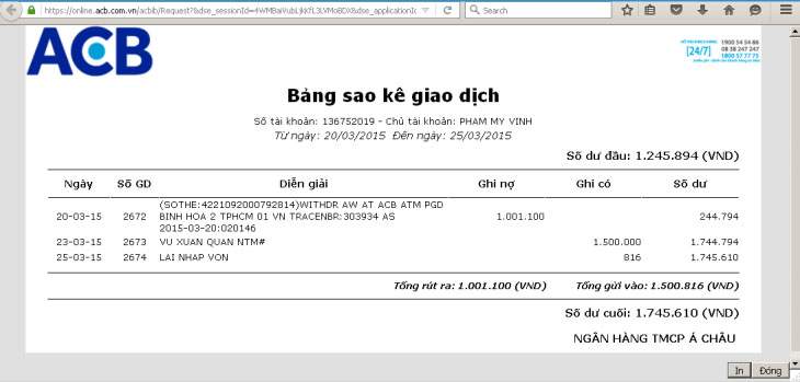 Ngoài ra, nếu bạn muốn tiết kiệm thời gian ra ngoài, ACB còn hỗ trợ việc tra cứu và in sao kê trực tuyến thông qua ứng dụng ACB ONE hoặc trang web của ngân hàng. Bạn chỉ cần đăng nhập vào tài khoản, vào mục “Sao kê tài khoản” và làm theo hướng dẫn là có thể tải xuống phiên bản sao kê mà không mất phí.