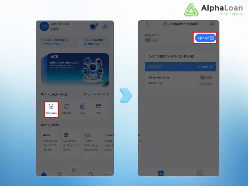 Ngoài ra, bạn cũng có thể kiểm tra lịch sử giao dịch của mình qua ứng dụng Mobile Banking ACB hoặc truy cập vào ACB Internet Banking. Chỉ cần đăng nhập bằng tên đăng nhập và mật khẩu, bạn sẽ thấy ngay các thông tin liên quan đến tài khoản của mình. Đặc biệt, nếu bạn có dịch vụ SMS Banking, việc tra cứu cũng trở nên đơn giản hơn rất nhiều.