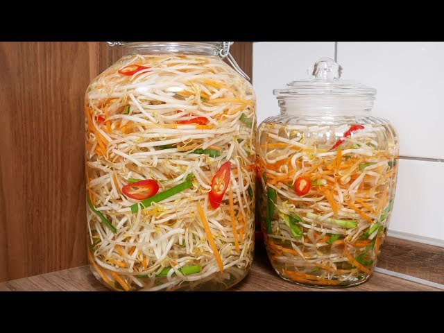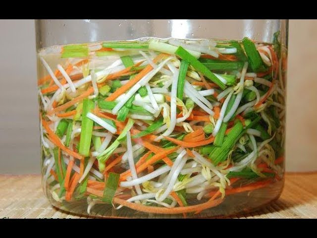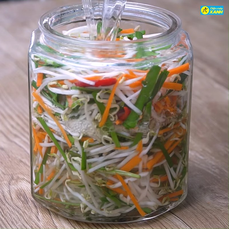 Tiếp theo, pha nước ngâm gồm nước lọc, muối, đường và giấm ăn theo tỷ lệ vừa phải, không nên quá mặn. Khuấy đều cho các gia vị tan hết rồi thả hành tím, ớt vào để tạo mùi thơm và vị cay nhẹ. Sau đó, trộn đều giá đỗ, hẹ và cà rốt rồi cho vào bình thủy tinh sạch, đổ nước ngâm sao cho ngập mặt nguyên liệu, dùng vật nặng ấn nhẹ để dưa không bị nổi lên trên không khí.