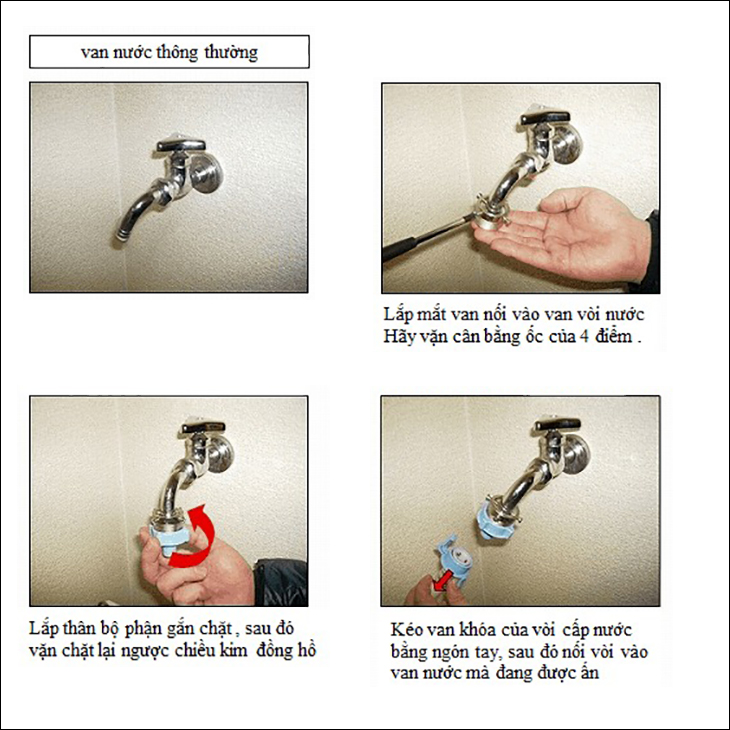 Nếu van nước nhà bạn loại thông thường, gắn mắt nối van vào vòi nước trước. Căn chỉnh 4 ốc vít sao cho cân bằng, vặn chặt tay từng đôi đối xứng để tránh lệch, gây rò rỉ. Với van có khớp vặn, chỉ cần nối trực tiếp dây vào là được.