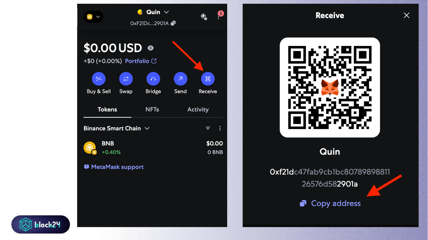 Để lấy địa chỉ ví blockchain, bạn chỉ cần đăng nhập vào ví của mình, sau đó tìm mục thường gọi là “Receive” hoặc “Nhận” trong giao diện ví. Khi chọn vào đó, ví sẽ hiển thị địa chỉ ví dưới dạng một chuỗi ký tự dài hoặc mã QR để bạn có thể chia sẻ cho người khác gửi tiền vào. Địa chỉ ví này chính là public key, giống như số tài khoản ngân hàng dùng để nhận tiền mã hóa.