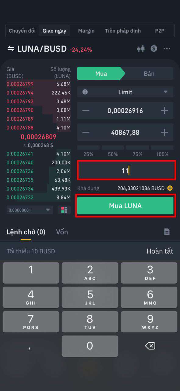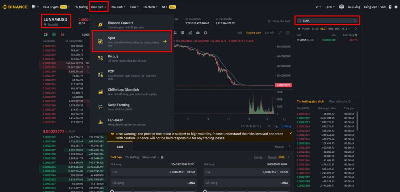 Khi đã có tiền trong ví Giao ngay, bạn vào mục Giao dịch, chọn cặp LUNA/BUSD hoặc LUNA/USDT để đặt lệnh mua. Bạn có thể chọn mua theo giá thị trường (Market) để mua nhanh hoặc đặt lệnh giới hạn (Limit) nếu muốn mua ở mức giá cụ thể.