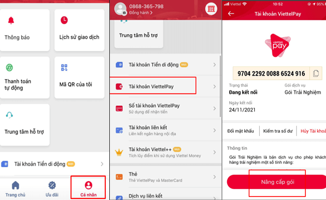 Đầu tiên, bạn hãy đăng nhập vào tài khoản Viettel Money của mình. Tại màn hình chính, chọn mục “Cá nhân”, sau đó tìm và chọn “Tài khoản ViettelPay”. Tuy nhiên, khác với gói tiêu chuẩn, để nâng cấp lên gói 3, bạn cần đến trực tiếp quầy giao dịch của Viettel, mang theo giấy tờ cần thiết. Hiện nay, Viettel đã ngưng cung cấp gói 2, nên khả năng nâng cấp chỉ áp dụng từ gói 1 lên trực tiếp gói 3.