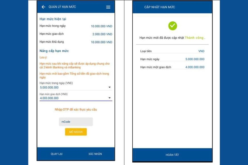 Sau khi đã thực hiện các bước trên, để nâng hạn mức chuyển tiền từ 1.5 tỷ lên 5 tỷ đồng/ngày, bạn cần kích hoạt tính năng Smart OTP hoặc mSign. Đây là bước quan trọng, giúp đảm bảo giao dịch của bạn an toàn và thuận lợi.