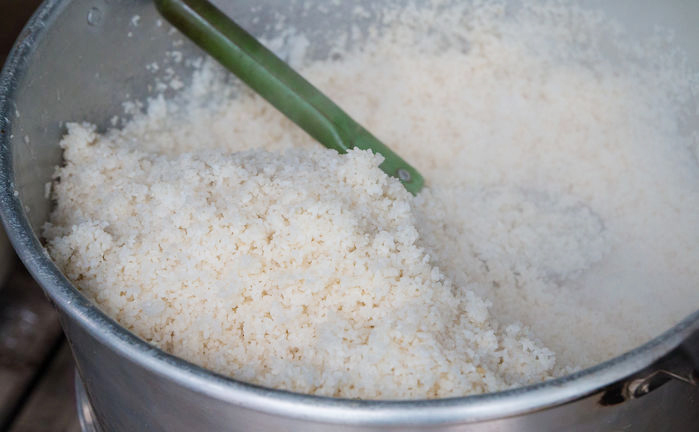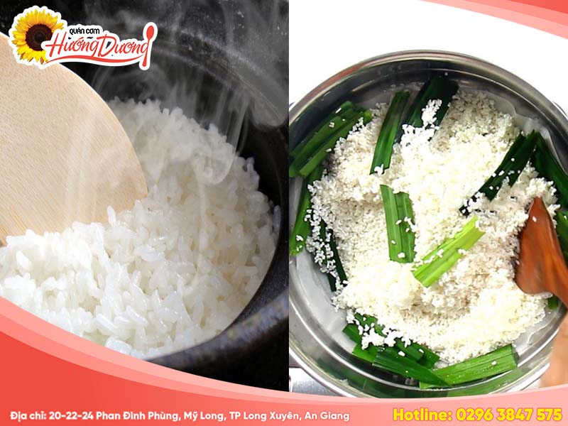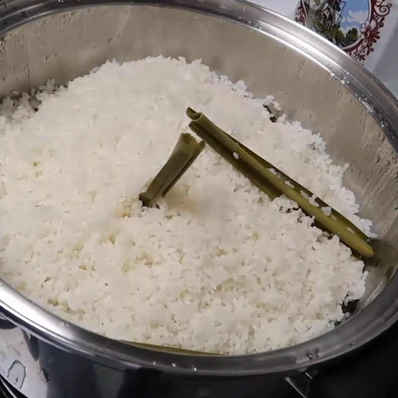 Bắt tay vào thực hiện, đầu tiên bạn nên vo sạch gạo tấm từ 3 đến 4 lần để loại bỏ bụi bẩn. Sau khi ngâm gạo khoảng 30 phút, hãy xếp gạo lên trên lá dứa đã được trải đều trong xửng hấp. Đun nước đến khi sôi, rồi cho gạo vào hấp khoảng 30 đến 40 phút. Chú ý, sau 20 phút mở nắp và xới đều để cơm chín đều.