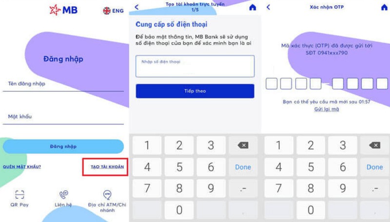 Để bắt đầu, bạn chỉ cần tải ứng dụng MB Bank về điện thoại. Sau khi tải xong, mở app và nhấn “Tạo tài khoản”, rồi nhập số điện thoại của mình. Một mã OTP sẽ được gửi đến số điện thoại bạn đã nhập, chỉ cần nhập mã đó để hoàn tất đăng ký tài khoản.