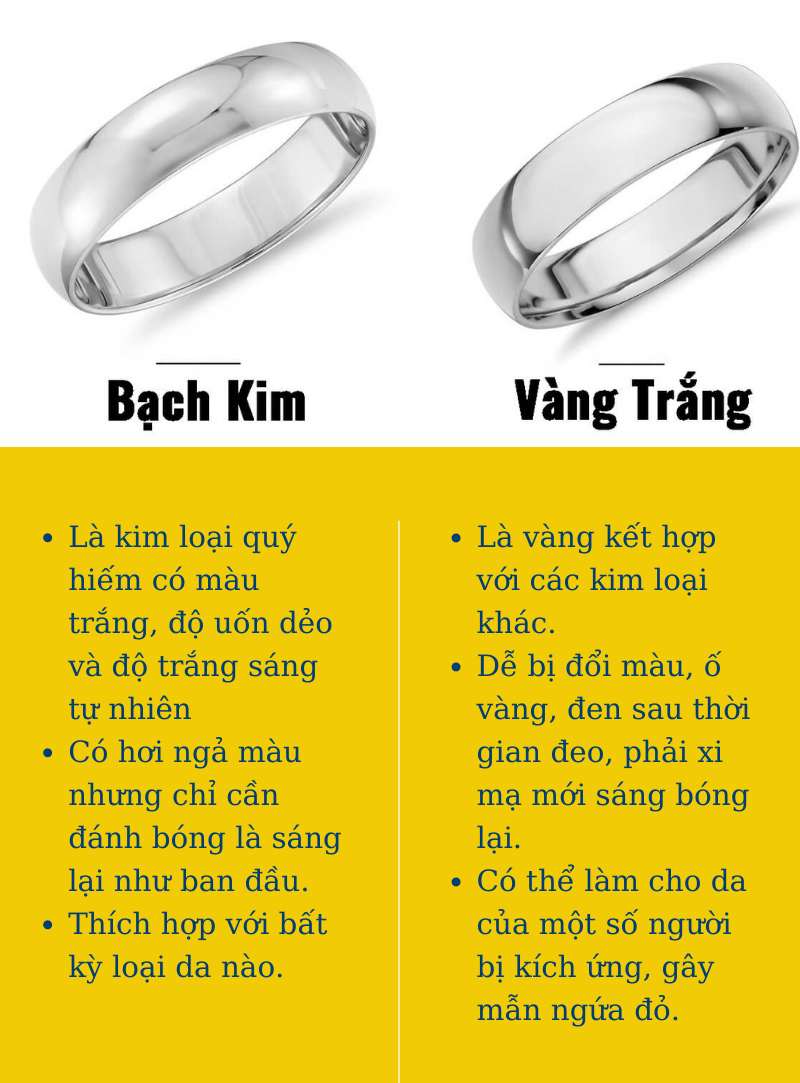 Việc phân biệt bạch kim với vàng trắng hay bạc có thể thực hiện dễ dàng bằng mắt thường hoặc qua các phương pháp như kiểm tra acid. Bạch kim sẽ không bị ảnh hưởng bởi acid, còn bạc khi tiếp xúc có thể để lại dấu hiệu. Nhờ vào tất cả những đặc tính tuyệt vời, bạch kim không chỉ là lựa chọn hoàn hảo cho trang sức mà còn là một đầu tư giá trị lâu dài.