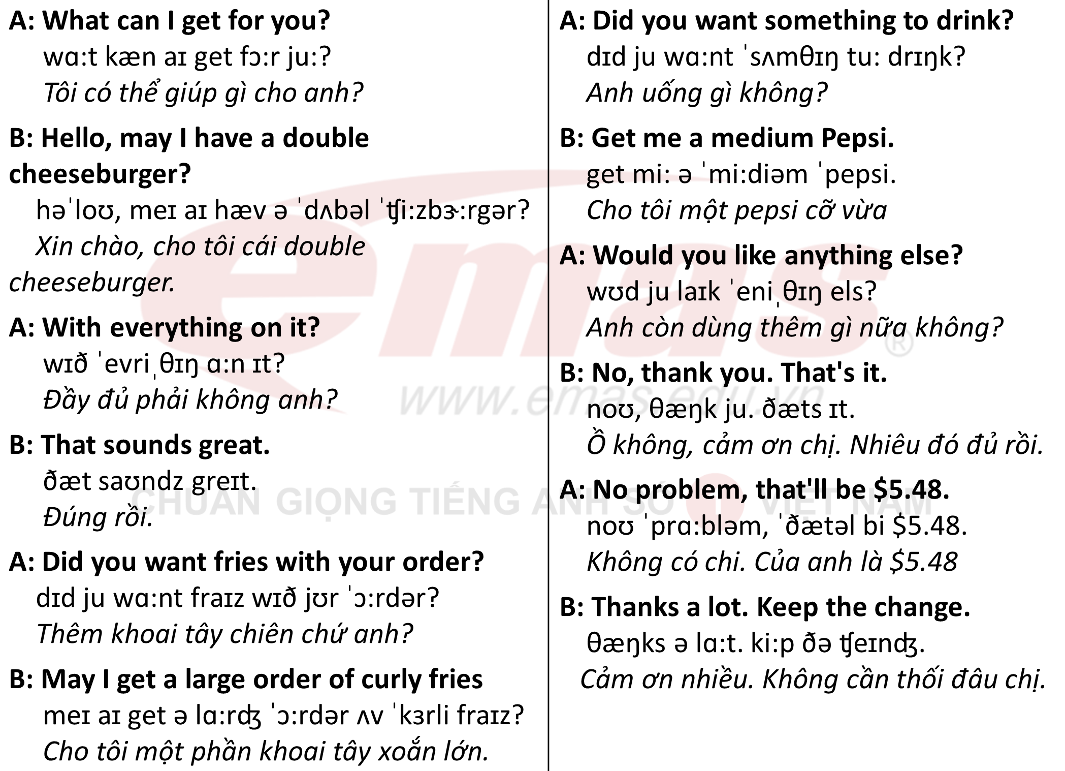 Khi gọi món, có thể dùng câu như “Excuse me, I’d like to order a hamburger and fries, please.” Để dễ dàng hơn, bạn có thể phân loại các món ăn: chưa ăn starter (món khai vị), main course (món chính), và dessert (món tráng miệng). Nếu bạn muốn món ăn nhanh, hãy nhớ tới các từ như fried chicken, hamburger hay hot dog.