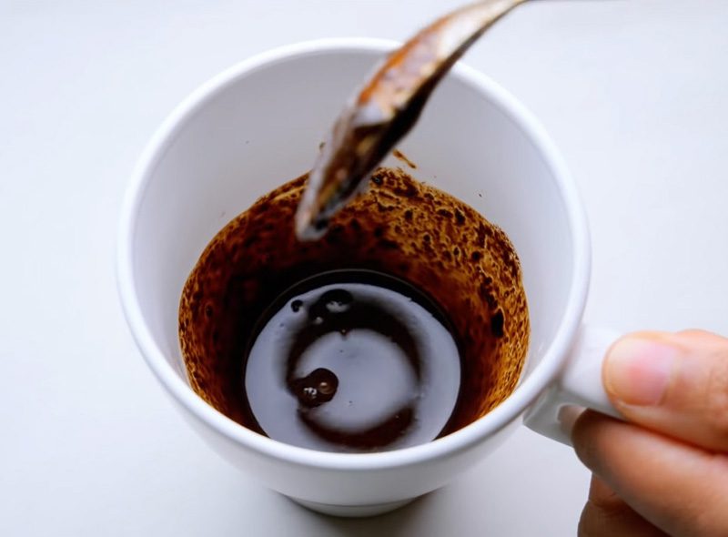 Tiếp theo, để lớp bột cà phê hòa tan thật tốt, bạn có thể rót một ít nước lạnh vào trước. Khuấy nhẹ nhàng để tạo thành hỗn hợp sệt, bí quyết này giúp cà phê hòa quyện hoàn hảo hơn khi chế nước sôi vào sau. Khi đã hoàn thành, bạn sẽ thấy nước cà phê có màu nâu đậm và độ sánh vừa phải.
