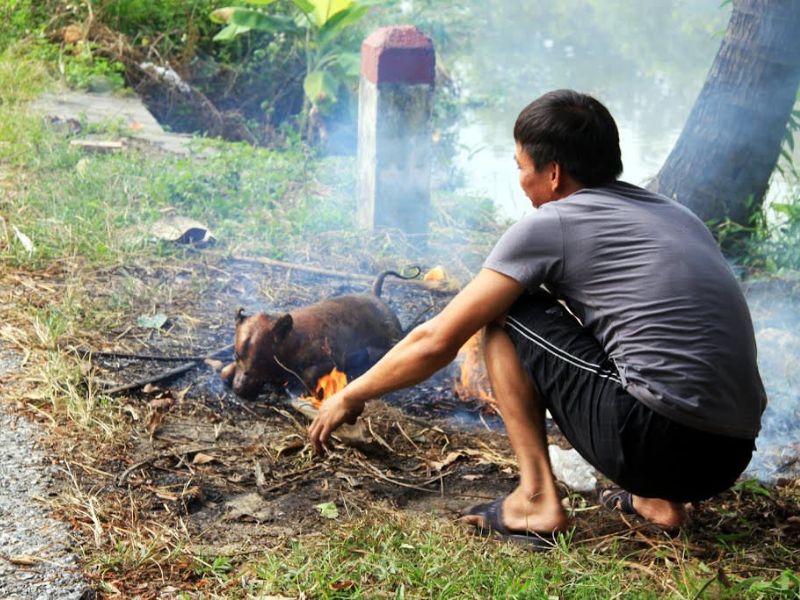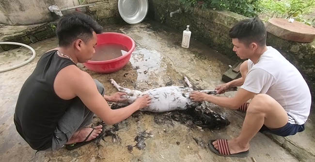 Lượng nước phải đủ ngập cả con chó, thường dùng nồi lớn để ngâm toàn bộ trong 2-3 phút. Nhúng đều từ đầu đến đuôi, vớt ra ngay kẻo lông bị nấu chín, vặt không mượt.