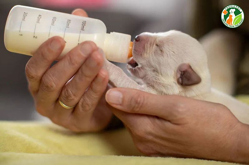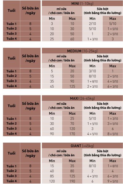 Khi nuôi chó con mới đẻ, việc cung cấp sữa bột đúng lượng là rất quan trọng để đảm bảo sự phát triển khỏe mạnh của chúng. Trong tuần đầu tiên, bạn chỉ nên cho chó con uống 10–15ml mỗi lần ăn, chia thành 8–10 bữa mỗi ngày với khoảng cách 2 giờ giữa các bữa. Điều này giúp chú cún hấp thụ dinh dưỡng tốt hơn và tránh tiêu chảy.